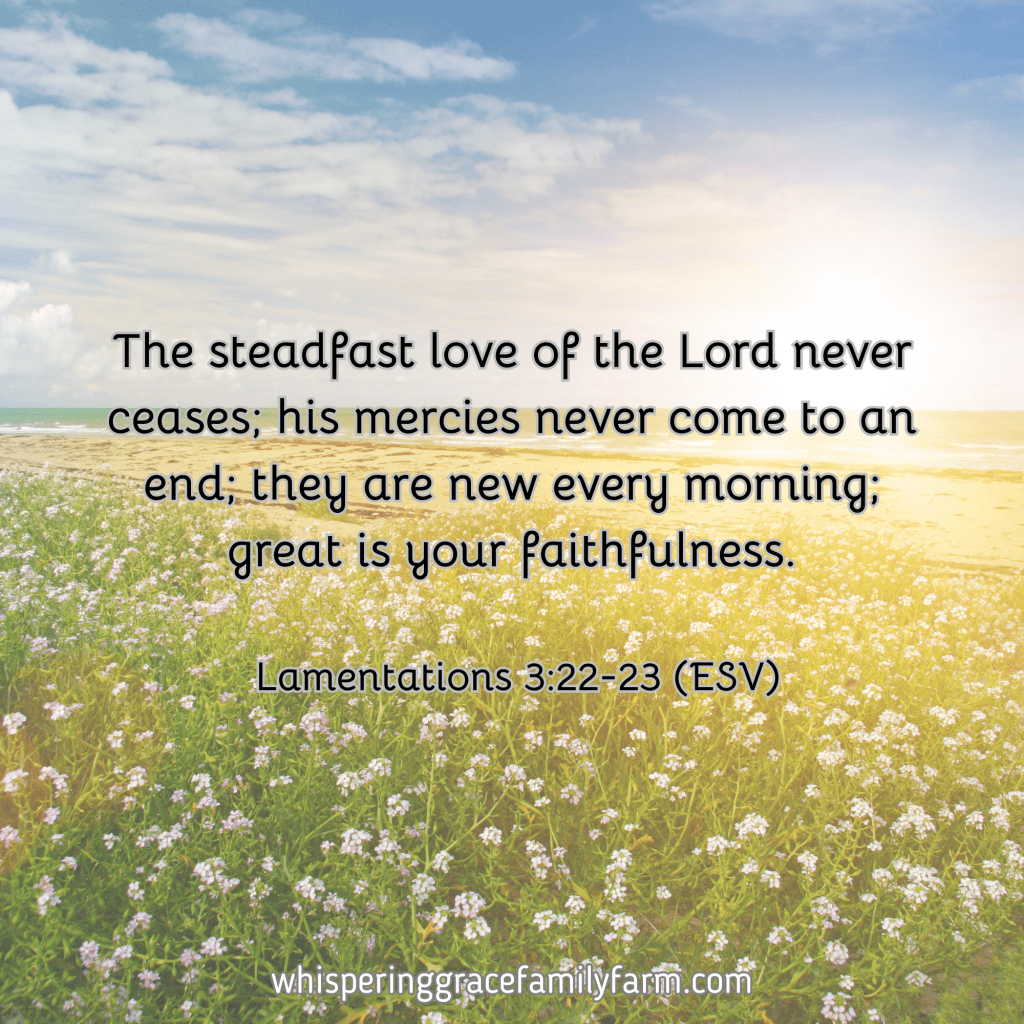 “The steadfast love of the Lord never ceases; his mercies never come to an end; they are new every morning; great is your faithfulness.” — Lamentations 3:22-23 (ESV)